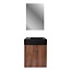 De bruine onderkast wordt gekenmerkt door een mooi verticaal reliëf patroon. De onderkast is voorzien van een greeploze zwaaideur met soft-close sluiting, voor een rustige en subtiele sluiting. Het biedt voldoende ruimte voor het bergen van toiletbenodigdheden. De fontein wastafel is afgewerkt in een mat zwarte kleur en is een mooie eye-catcher en must-have. De toiletspiegel heeft een mat zwarte lijst en zorgt daarmee voor een mooi stukje detail in de toiletruimte.