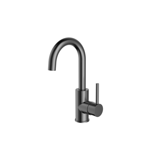 Gunmetal wastafelkraan met 360° draaibare uitloop, slijtvaste coating en waterbesparende perlator. Duurzaam, roestvrij en elegant industrieel design. Lees meer.