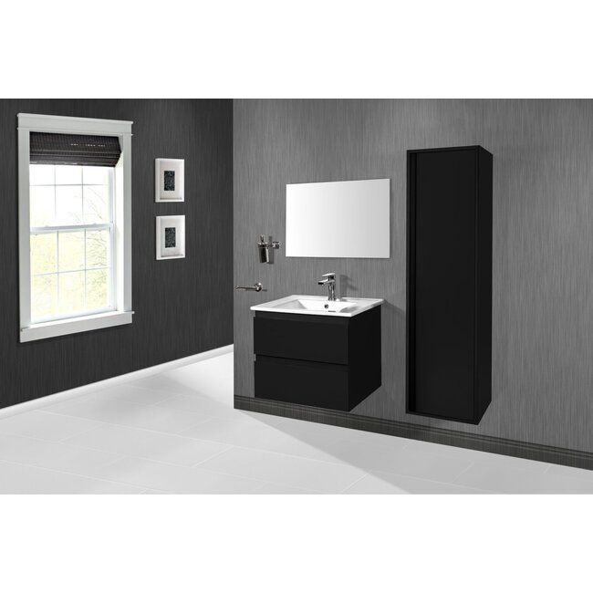 Badkamermeubelset 60 cm met mat zwarte onderkast en keramische wastafel. Modern greeploos design, softclose lade en onderhoudsvriendelijk keramiek. Perfect voor compacte badkamers. Lees meer.